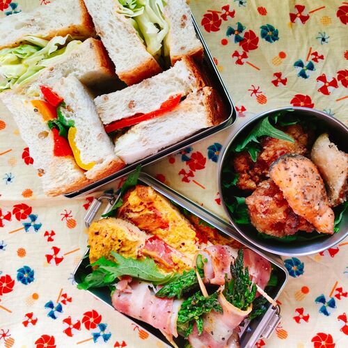 祖父の祥月命日でしたので和弁当。 炊き込みご飯(人参・ごぼう・椎茸・油揚げ) おさしみコンニャクとシナチクの胡麻酢生姜和え 生あおさと竹輪の天ぷら サツマイモの甘煮 卵焼き インゲンのベーコン巻き 塩麹浅漬け(キャベツ・大根・人参) (カフェオレ…